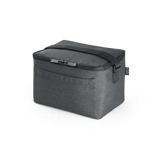 Descrição: Bolsa térmica em 600D poliéster reciclado (100% rPET) com interior em PEVA. Alça ajustável em webbing, bolso frontal e fecho duplo. Certificação EU Food Grade.