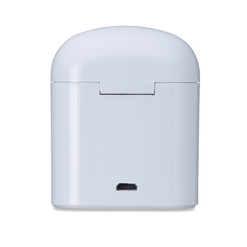 Descrição: Com bluetooth plástico com case carregador. Frequência 2.4 -2.485GHz e alcance 10 de metros. Acompanha cabo USB.